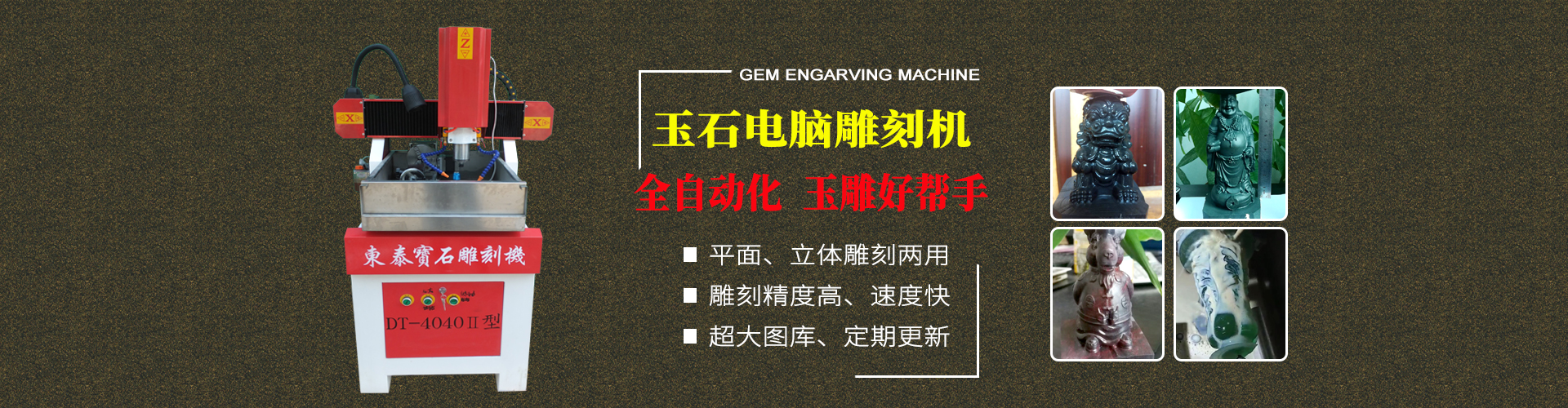 東泰生產出的寶石機械設備可用于加工晶體雜石、瑪瑙玉石、人造石、其他石類及貝殼、骨頭化石等等,加工出的產品孔位精確、損耗小、速度快、效率高;雕刻品細致、精美,大大降低了成本,提高了效率,深受寶石行業商家的歡迎。